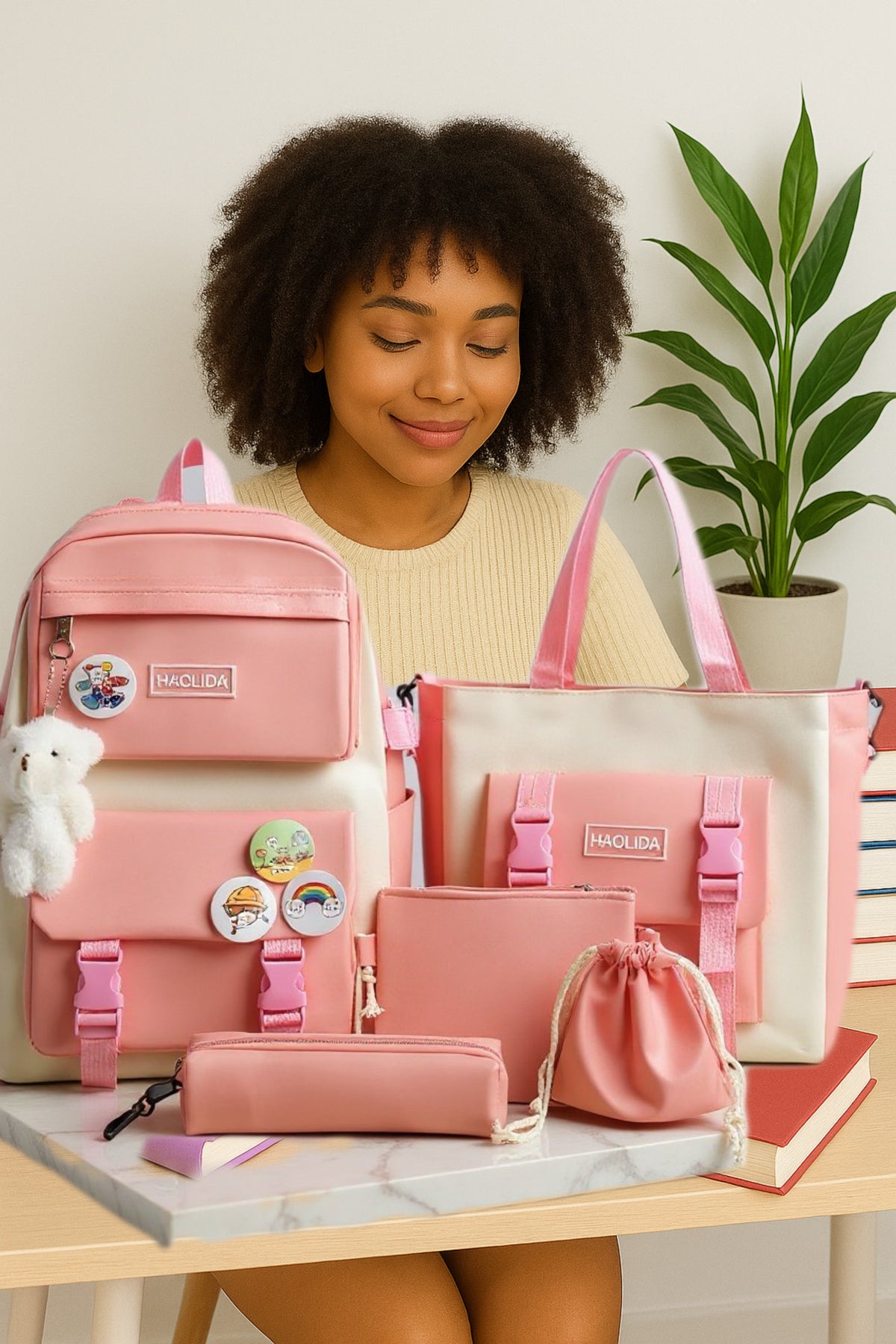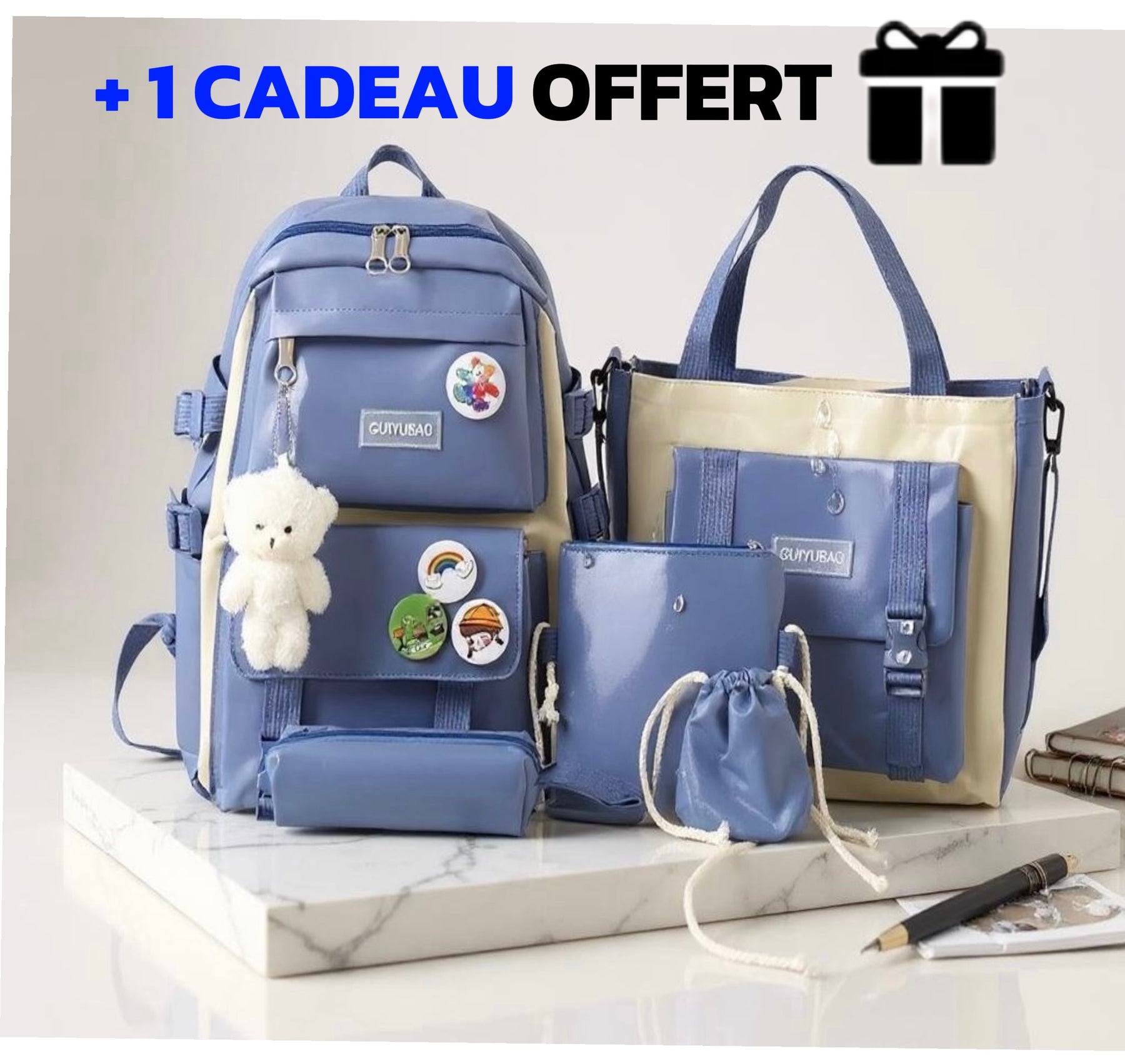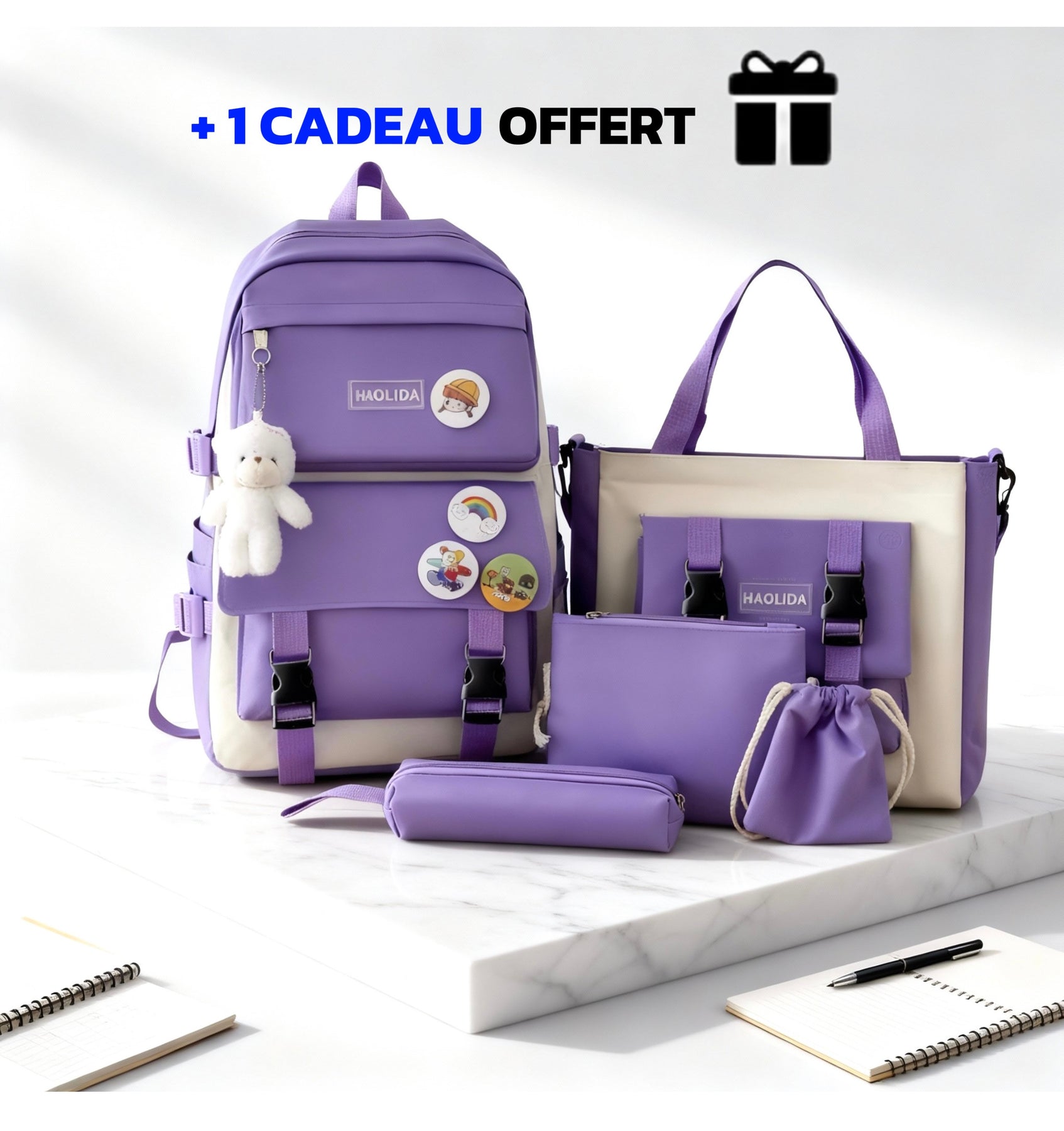 Ce lot comprend 1 sac à dos spacieux, 1 sac à main élégant, 1 sac bandoulière pratique, 1 trousse de rangement et 1 pochette à cordon. En bonus : 4 assortiment de broches colorées + 1 pendentifs tendance en nounous pour un style 100% personnalisé. Ce sac est idéal pour les élèves du primaire, 6ème, 5ème, et 4ème.